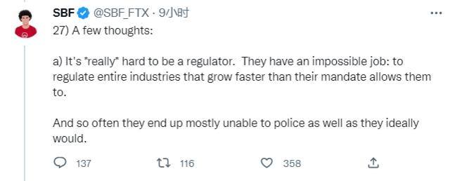 关于行业监管问题,SBF还表示,做监管者真的很难。他们有一项不可能完成的工作——监管整个行业,而这些行业的增长速度超出了他们的任务授权范围。因此,他们往往无法像理想情况下那样进行监督。