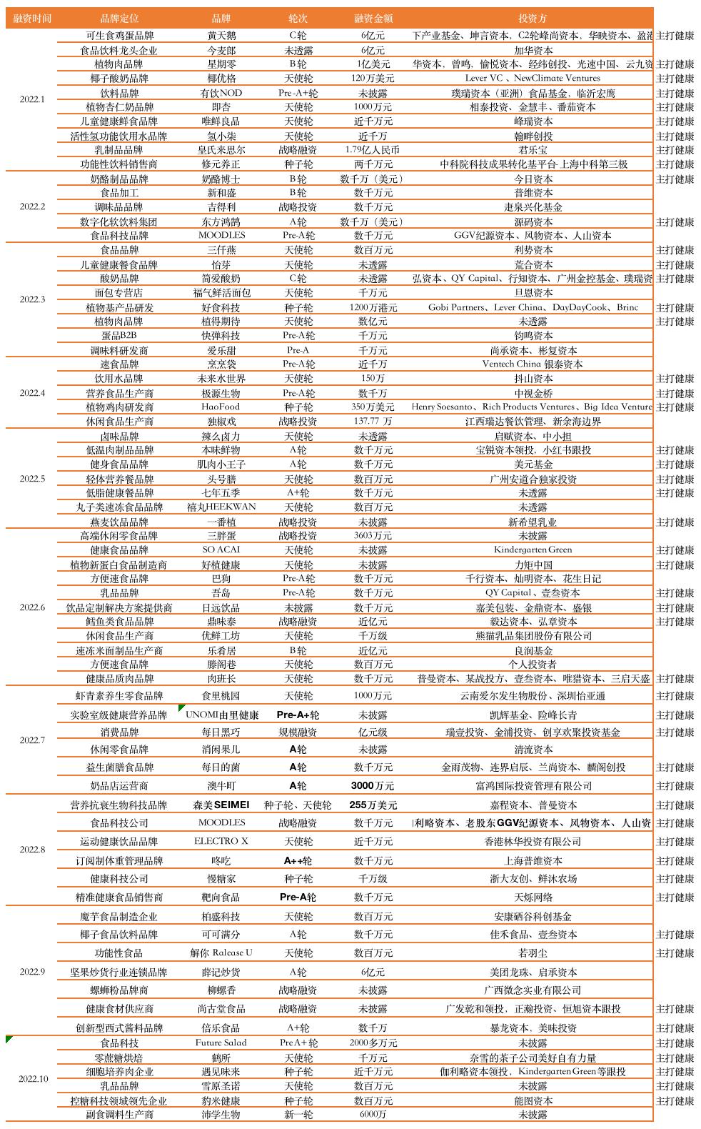 具体来看,“植物基”的概念仍然受到关注,2022年10月前共有7家植物基概念的企业获得融资,融资总金额高达数亿元,其中最高的是植物肉品牌「星期零」获得了1亿美元的B轮融资,另外一家植物肉品牌「植得期待」也获得了数亿元的天使轮融资。