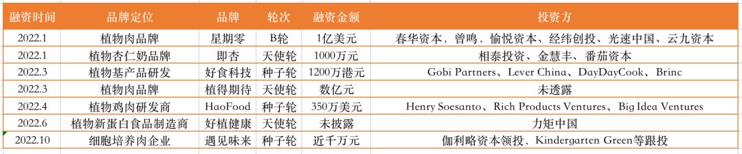 从融资轮次来看,除了「星期零」在A轮后,其他企业融资都处于A轮前,且融资的时间也没有太密集,投资机构对植物肉、植物奶等仍在持续关注。