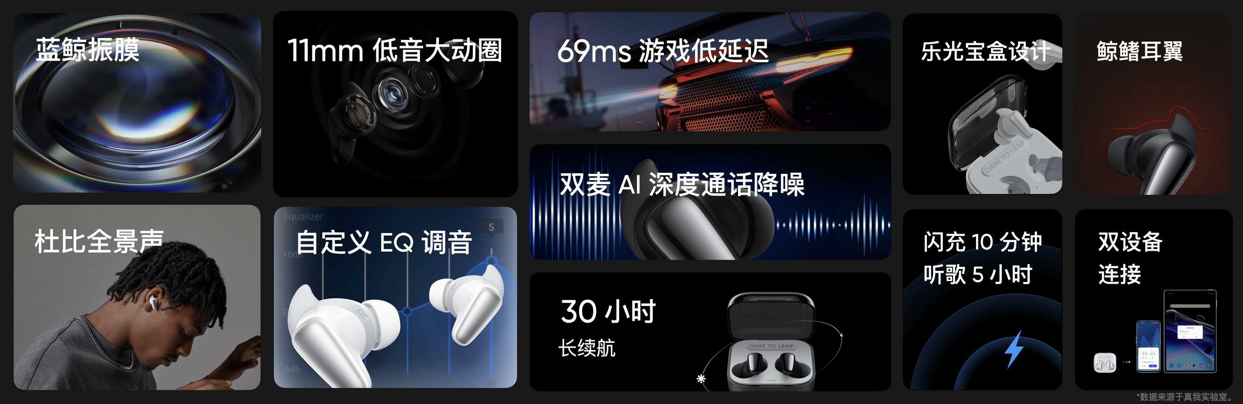 与真我10系列一同发布的,还有TWS耳机产品真我Buds Air 3S。真我Buds Air 3S采用全新研发的蓝鲸振膜,11mm低音大动圈,支持杜比全景声Dolby atmos,耳机杆采用鲸鳍耳翼设计,佩戴更舒适稳固,还有30小时超长续航、自定义EQ调音、69ms游戏低延时等体验。