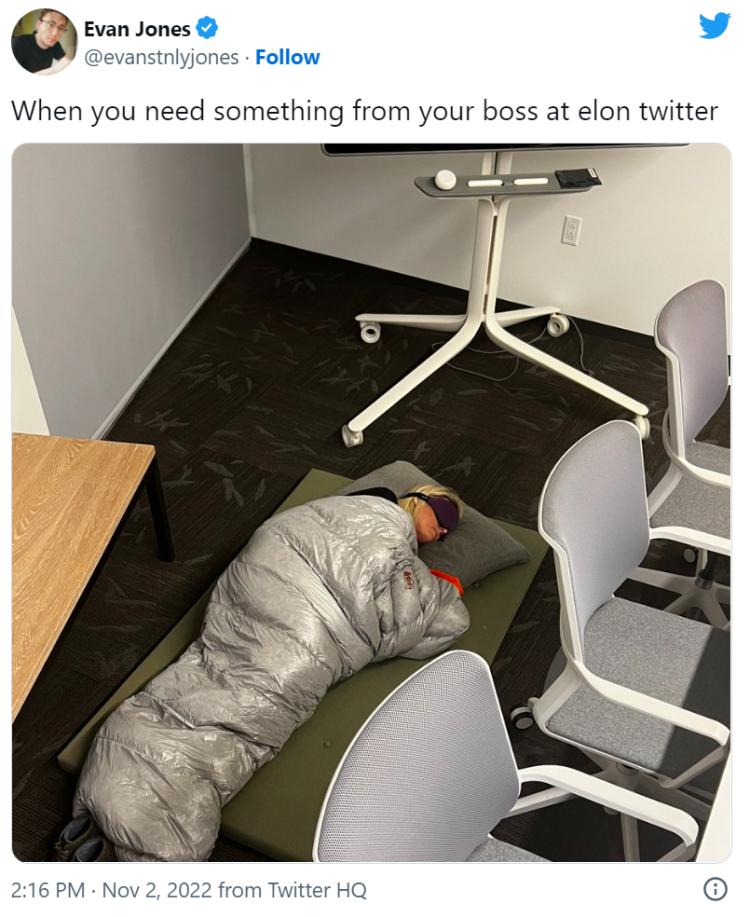Twitter部门主管干脆睡在公司,图源:Twitter @Evan Jones