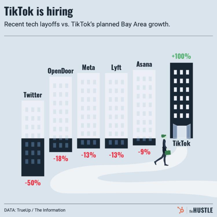 Twitter、OpenDoor最近的裁员比例,以及TikTok在湾区的员工数翻倍招聘计划。图源:The Hustle
