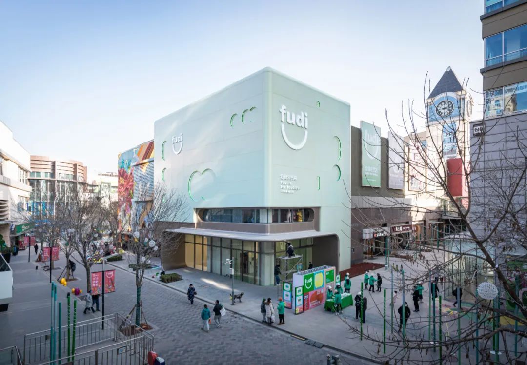 从外观设计上,Fudi门店参考了网红店的风格,比如薄荷绿矮楼,网眼状的外壳,墙面之间的折角呈圆弧,吸引不少消费者前来打卡参观。