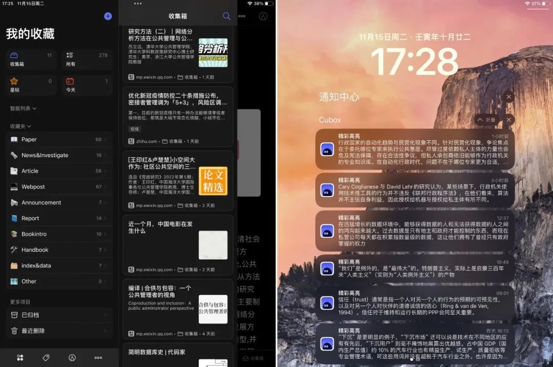 使用手机浏览微信、微博、bilibili、财新等信息来源,同样使用 Cubox 剪藏;
