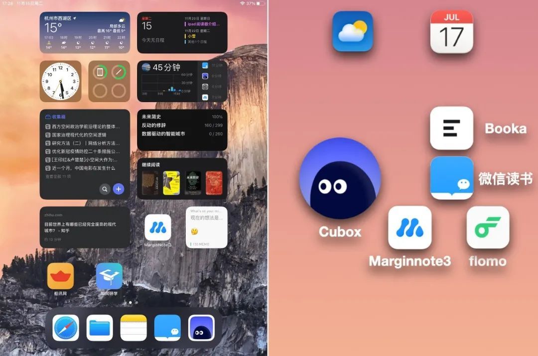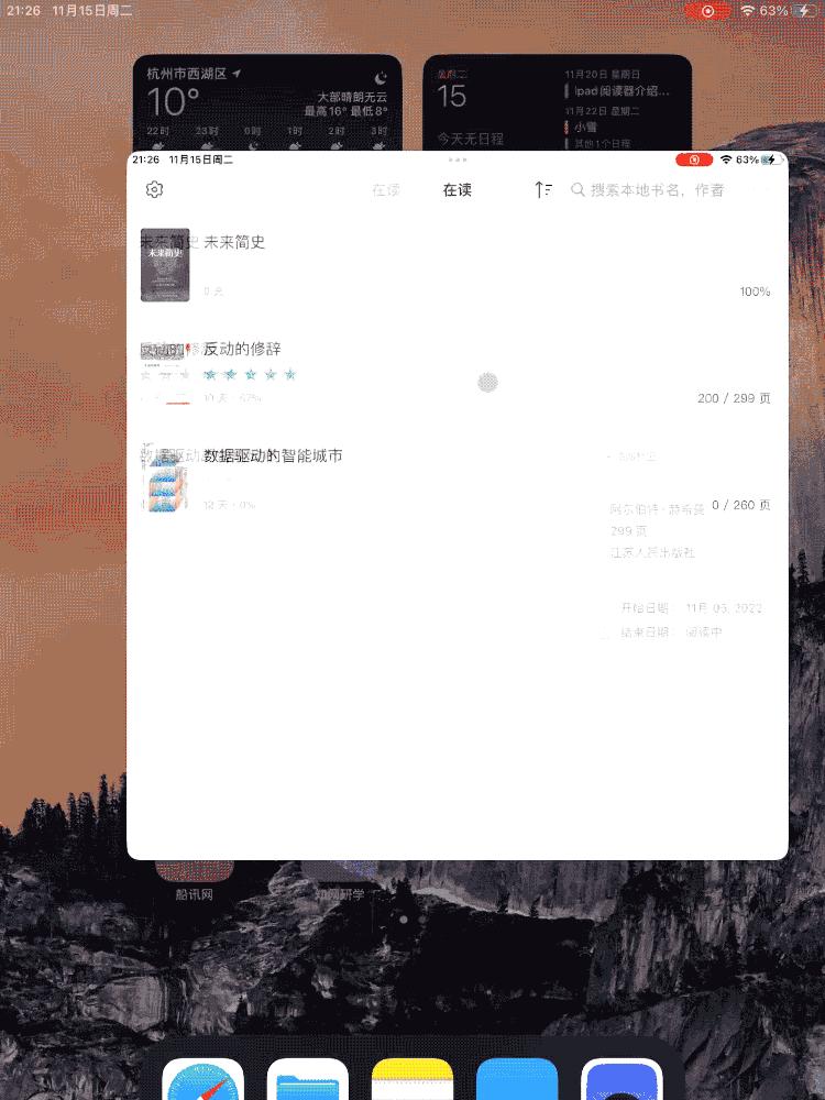 利用 iPadOS 的小组件功能,我将不同应用聚合到同一界面,可以方便地总览各类信息,进行阅读,管理进度。具体来说,我的阅读器软件应用可以分为四个部分。