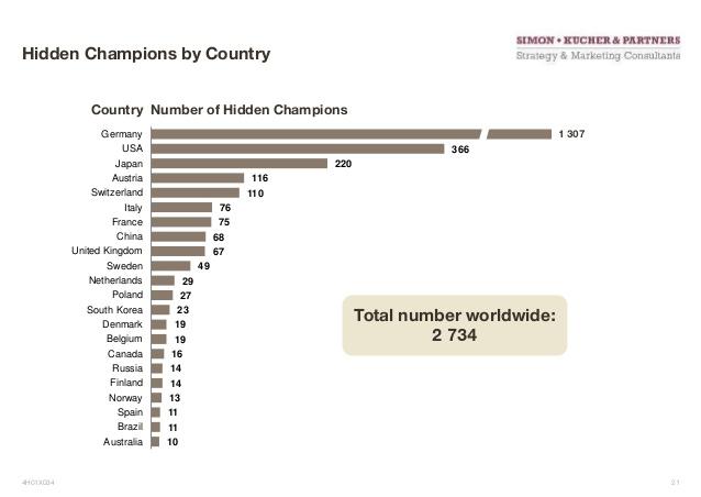 西蒙据标准统计而出的“隐形冠军”的绝对数量——