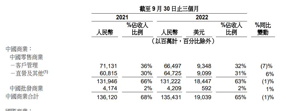 另外,中国商业的营收中,来自客户管理的营收为665亿元,较去年同期的711亿元减少7%。之所以中国零售业务营收还能保持仅1%的下滑,那是因为直营及其他实现了6%的增长,从608亿元增长到647亿元。