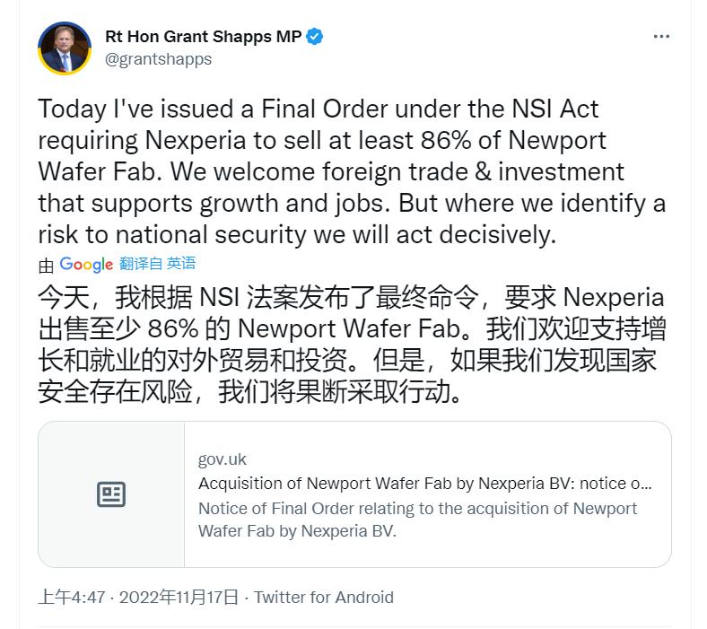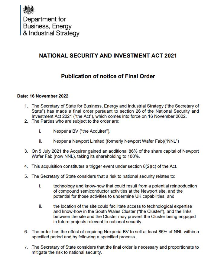 2022年11月,英国政府强制要求安世半导体出售NWF 86%的股权,这正是安世半导体在一年前追加收购的股份数量。