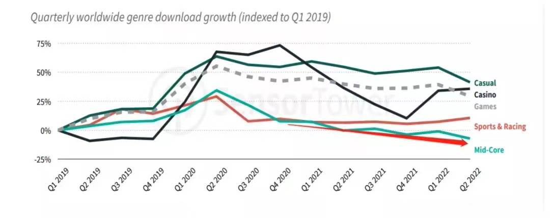 数据也佐证了上述观点。据SensorTower,2019年第一季度-2022年第二季度,全球游戏的下载量中,大型游戏的下滑趋势最为明显。