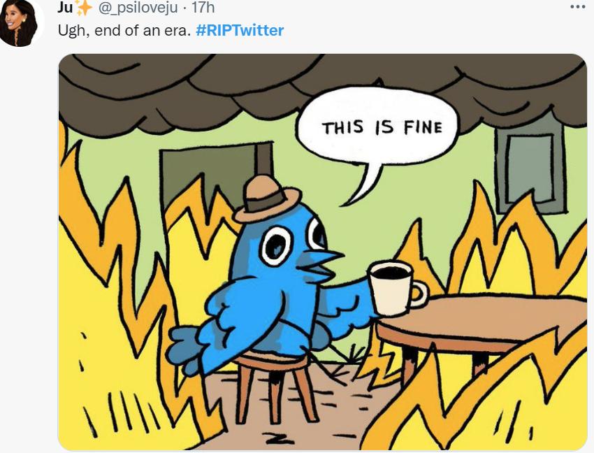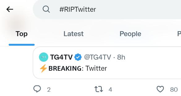 随着越来越来越多的Twitter员工宣布自己的离开,不少网友意识到,这事儿可能要闹大了。不少人 开玩笑说在这一轮之后 Twitter 就要彻底完蛋了, 调侃、笑话和梗图源源不绝冒出来 。 所以在当晚,#RIPTwitter 这个搞笑话题,一度霸占了 Twitter 热搜榜第一名。