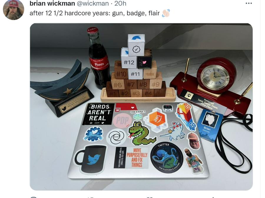 这些感言并不长,毕竟 Twitter 还是一个280字的社交平台。更多人发了自己的工卡和笔记本电脑的照片,配上一小段话。