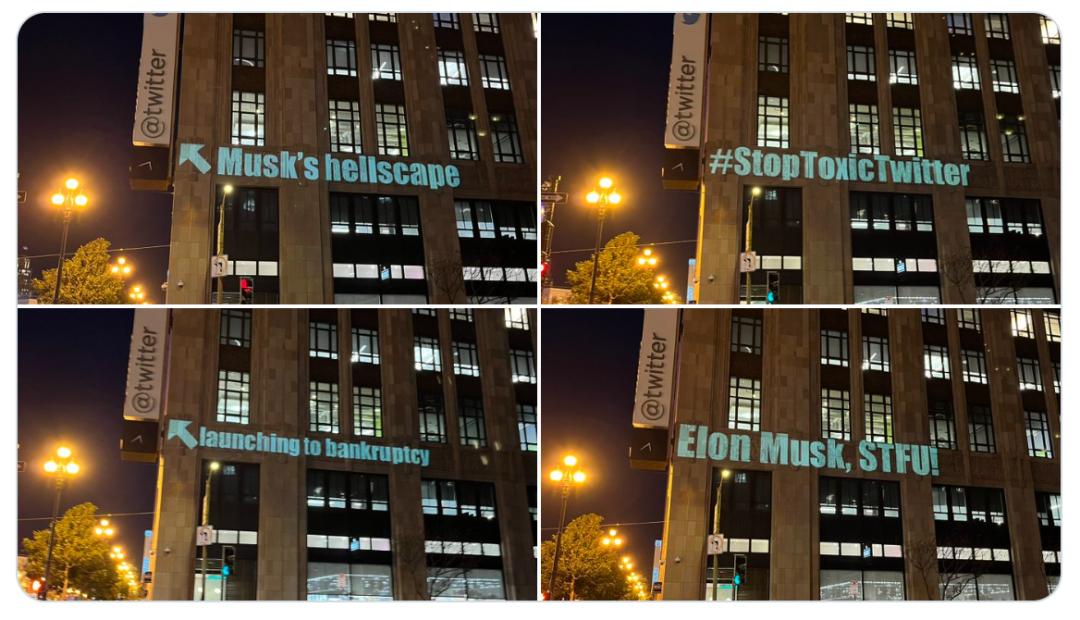在旧金山Twitter总部大楼附近,有人在街对面把对马斯克的不满通过投影的方式宣泄了一通。