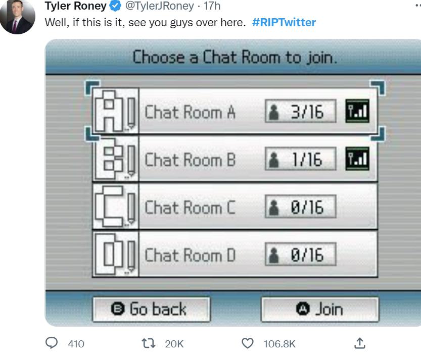 “如果 Twitter 没了,到 PictoChat 上来找我”(任天堂DS主机的聊天室功能)