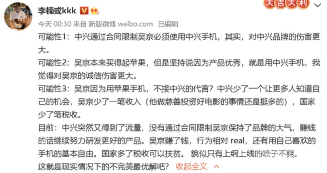 舆论瞬间炸开了,有网友表示,吴京既然代言了中兴手机,私下却用苹果手机,是不是不守职业道德?