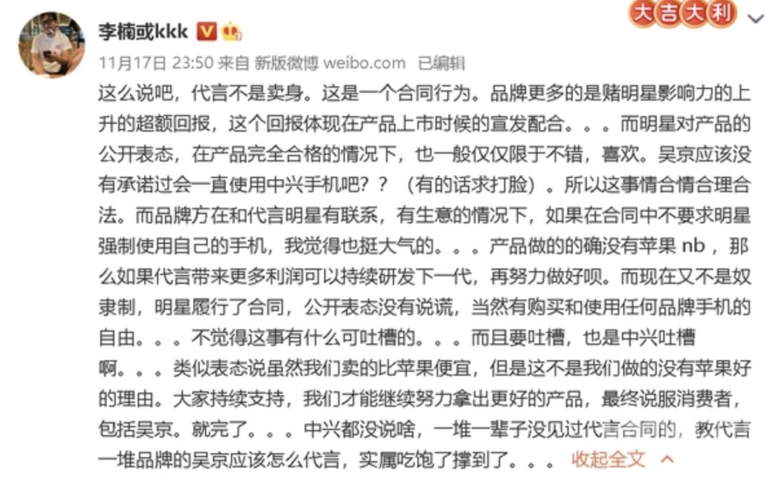 但众多网友显然还是不买账,见舆论还在持续咆哮,11 月 17 日,前魅蓝总裁李楠就发了微博力挺吴京。