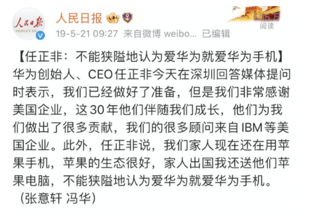 以前华为手机的掌舵人任正非也说过,自己和家里人也在用苹果手机;