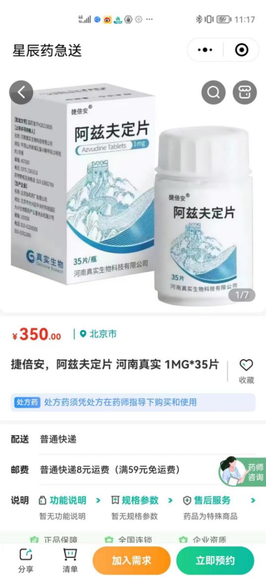 另一方面,此次阿兹夫定零售仅在线上开放。19日上午,记者走访北京市丰台区某海王星辰线下药店,并未发现在售的阿兹夫定片。询问店员后,对方表示未听说进货消息,“新冠的药物,那肯定没有”。当记者告知“星辰急药送”有在售药物信息后,店员表示“那应该是总部药物”,或由深圳市发货。