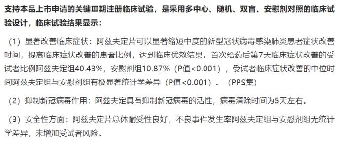 今年7月,真实生物的阿兹夫定片获国家药监局附条件批准,可用于治疗普通型新型冠状病毒肺炎(COVID-19)成年患者。用法用量为空腹整片吞服,每次5mg,每日1次,疗程至多不超过14天。