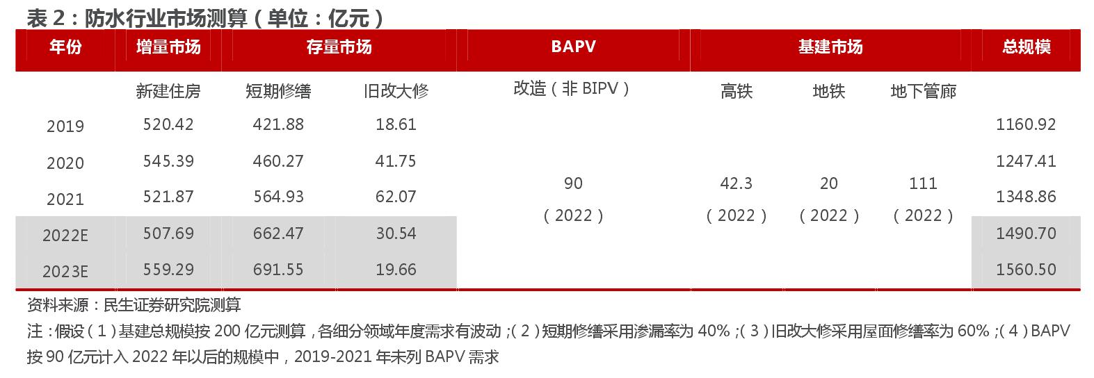 建筑修缮防水补漏是一个千亿级的蓝海市场。民生证券研究院将建筑防水市场分为局部补漏、小范围翻新和整体补漏、加固,大道城市更新。据测算2022-2023年防水市场规模约为1500-1600亿元。