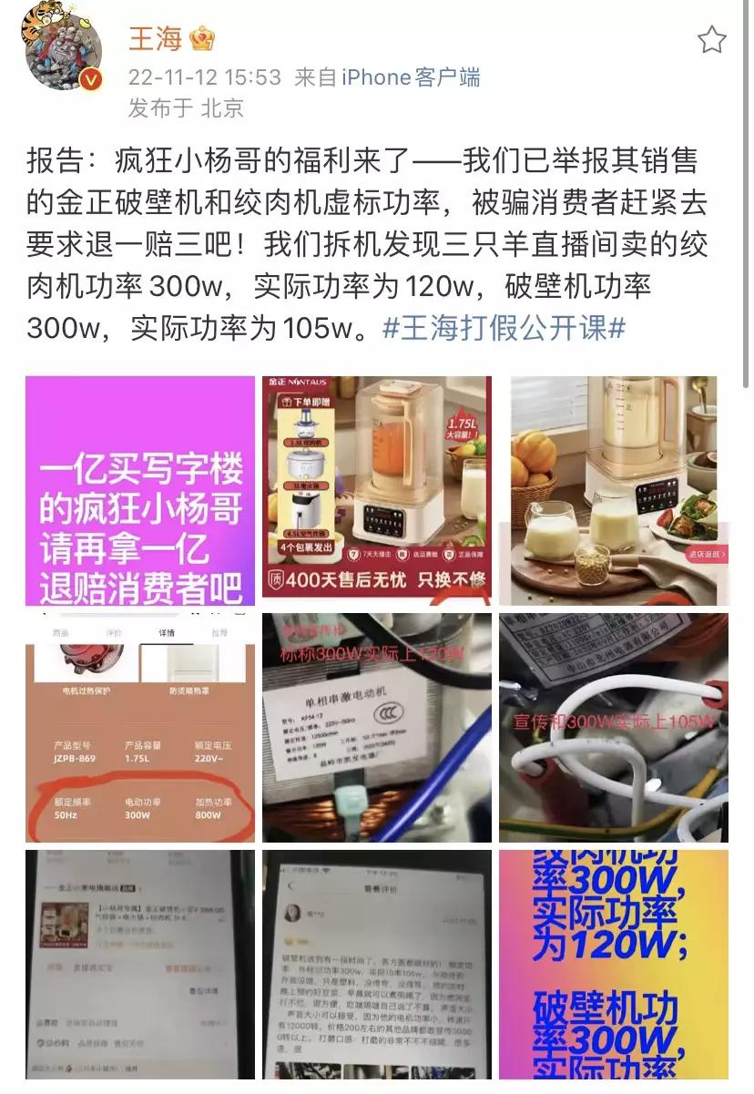 然而后脚,紧跟着就是知名打假人王海在抖音上发布视频表示,疯狂小杨哥的三只羊直播间里,售卖的金正破壁机和绞肉机,均为虚标功率参数。