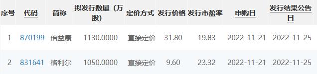 北交所打新股格利尔(831641)、倍益康(870199)将于11月21日进行网上申购,发行市盈率分别为23.32倍、19.83倍。