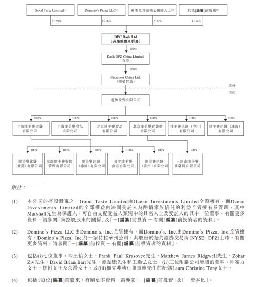 达势股份招股书中披露了当前公司的组织架构。截至招股书签署日,达美乐比萨持股达势股份15.66%,公司董事兼副主席James Leslie Marshall通过Good Taste Limited持股37.28%,为公司控股股东。