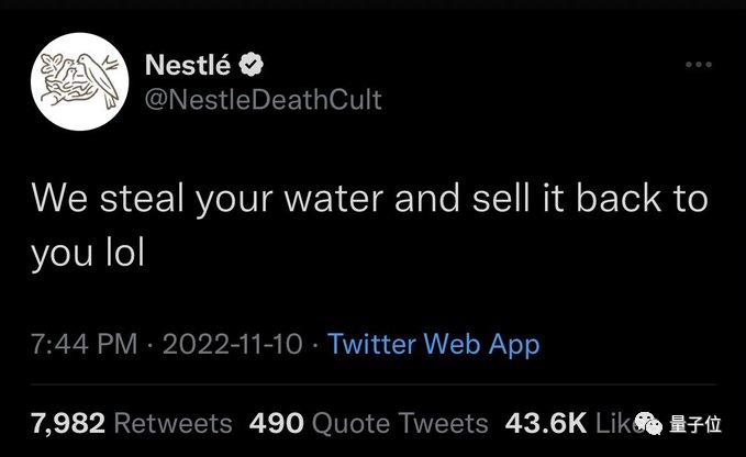 「雀巢」认证官号发推:我们偷了您的水,再卖回给您。一时勾起海量关注度,ID写上DeathCult,极具嘲讽味道。