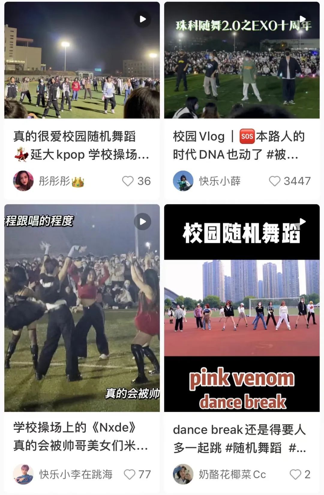 作为K-pop粉丝浓度最高的群体(没有之一),大学生本就是随舞的主力军。现实情况看似阻拦了他们前往校外参加随舞,实则给了他们在校内整活的机会。所谓山不见我,我去见山。对于大学生来说,去不了商场中庭的舞台,那就在校园的操场上自己搭建舞台。
