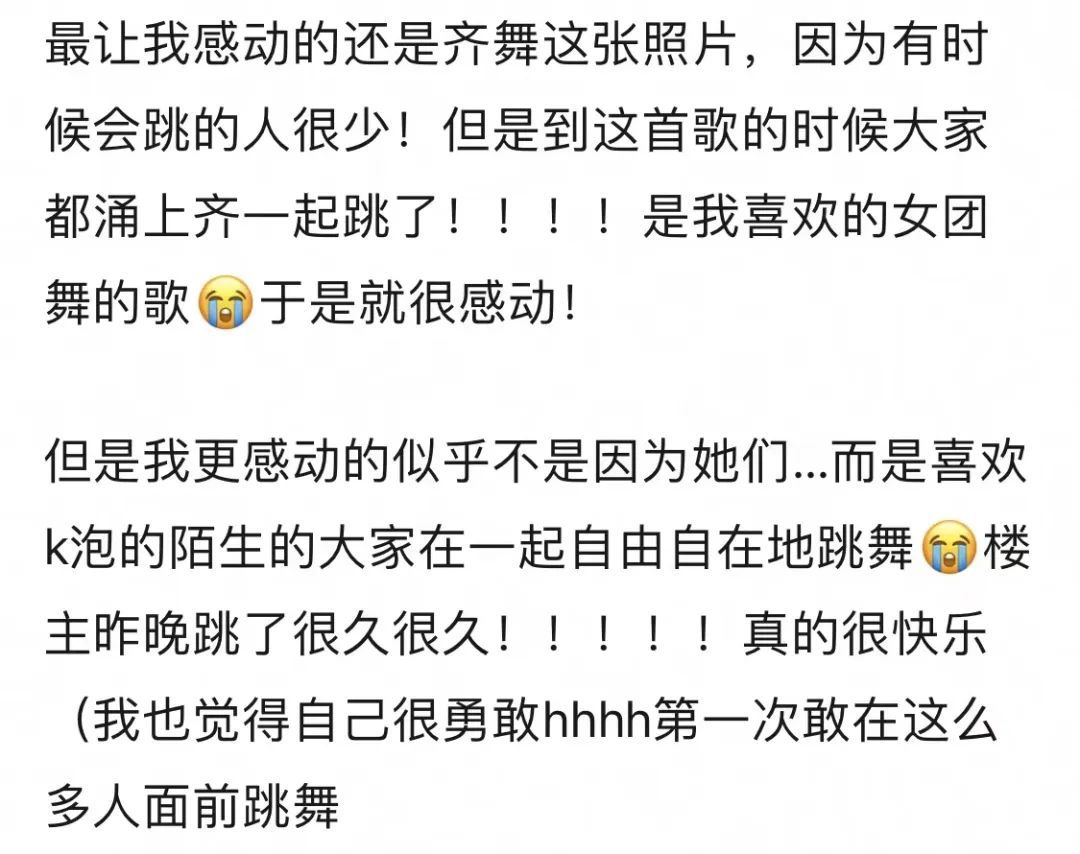 从此,用心扒的舞拥有了展示的机会,观众的热情变得即时可感,还有可能收获绝美直拍甚至是优先择偶权。就算舞技不算精湛,能认识同好当然也是一件美事。就算是社恐不敢搭讪,能跟着大家合唱或是大声喊出应援词也会很快乐吧。这种共鸣,是其他方式无法替代的。