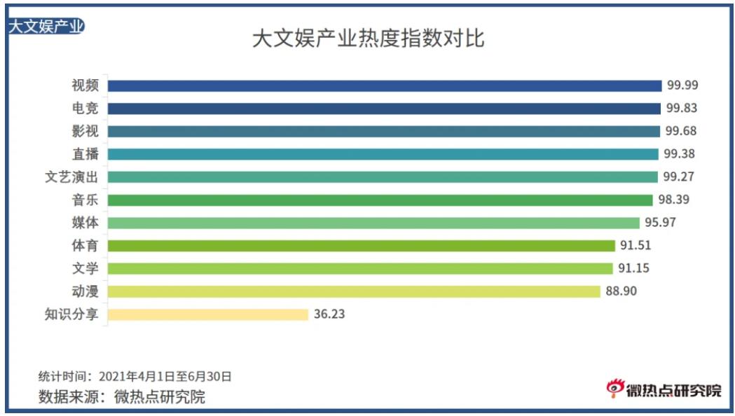 以中国地区为例。根据微热点研究院的统计,今年二季度,电竞以99.83的热度指数高居大文娱产业热度榜第二名,仅以微弱劣势不敌视频行业,但远高于热度指数91.51的体育行业。过去几年,英雄联盟S11、王者荣耀KPL、王者荣耀世冠赛均在互联网上掀起全民热议。