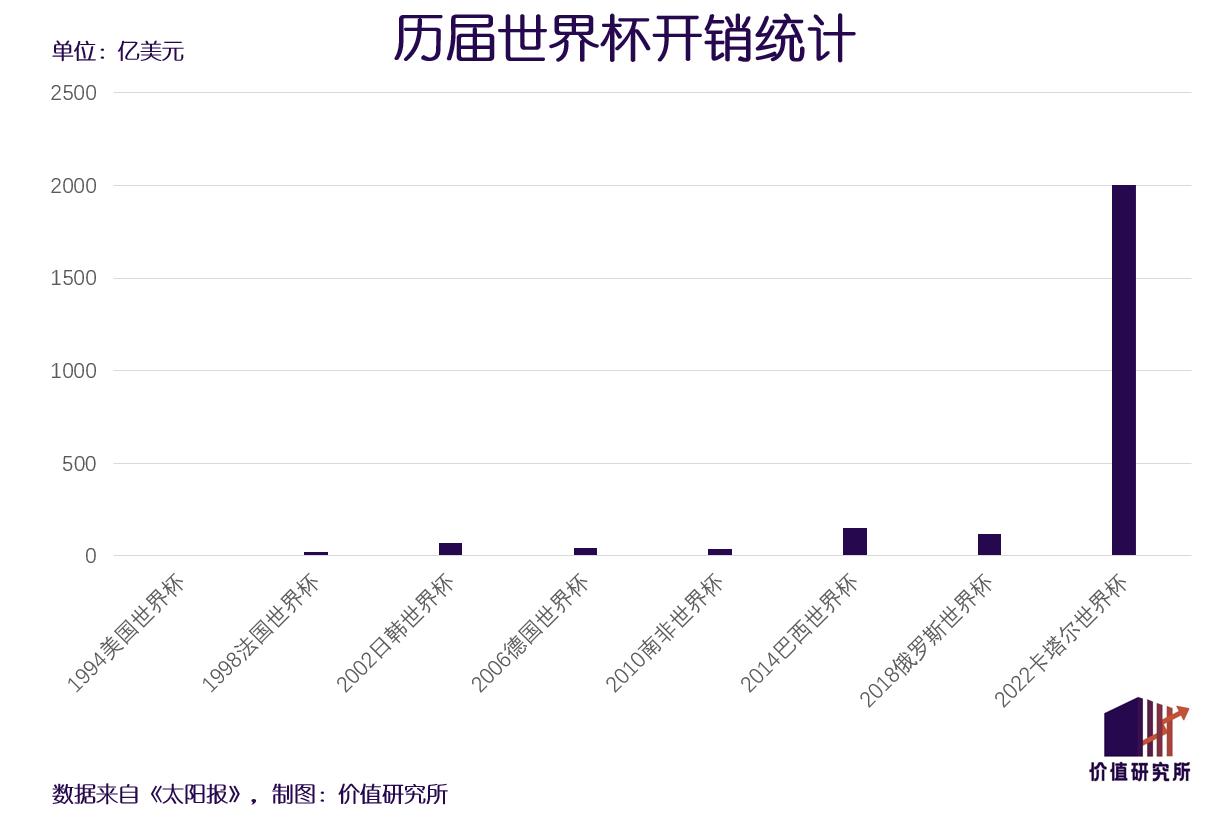 今年9月,英国《太阳报》为世界杯算了一笔账:1994年美国世界杯主办方开销总额为5亿美元,4年后的法国世界杯飙升至23亿美元,再往后的几届分别为70亿、43亿、36亿、150亿和116亿美元。到了2022年世界杯,官方公布的总开支高达2000亿美元。