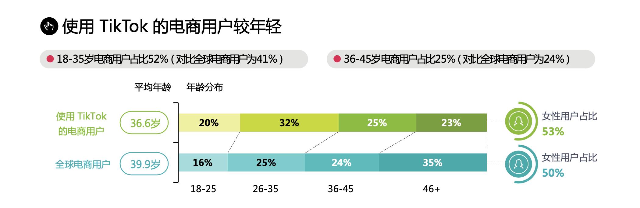 相较于传统数媒,TikTok 有着更年轻的用户群体。Deloitte 对全球20个重点国家、超万名电商消费者的调研数据显示, TikTok 上18-35岁电商用户达到了52%,全球电商用户为41%;36-45岁的电商用户占比25%,也高于全球电商用户的数值。