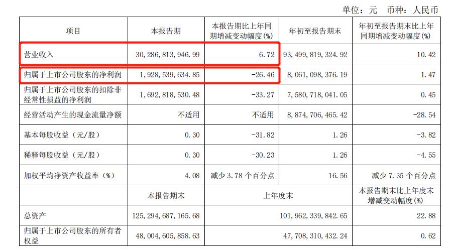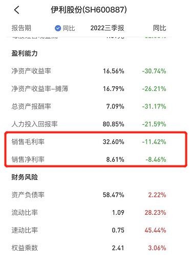 据伊利发布的2022年第三季度财报显示,Q3营业收入为302.87亿元,同比增长6.72%,营收上涨的同时,归属于上市公司股东的净利润却出现了26.24%的下滑。