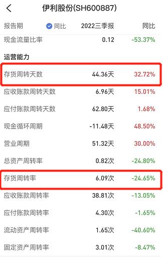 另外颇为尴尬的是,虽加大了销售费用的投入,但伊利的库存周转天数却出现了增加,据雪球的数据,截至三季度末,伊利库存周转天数为44.36天,同比增长32.72%,此外,与周转天数同比增长相对应的,则是库存周转率24.65%的同比下降。