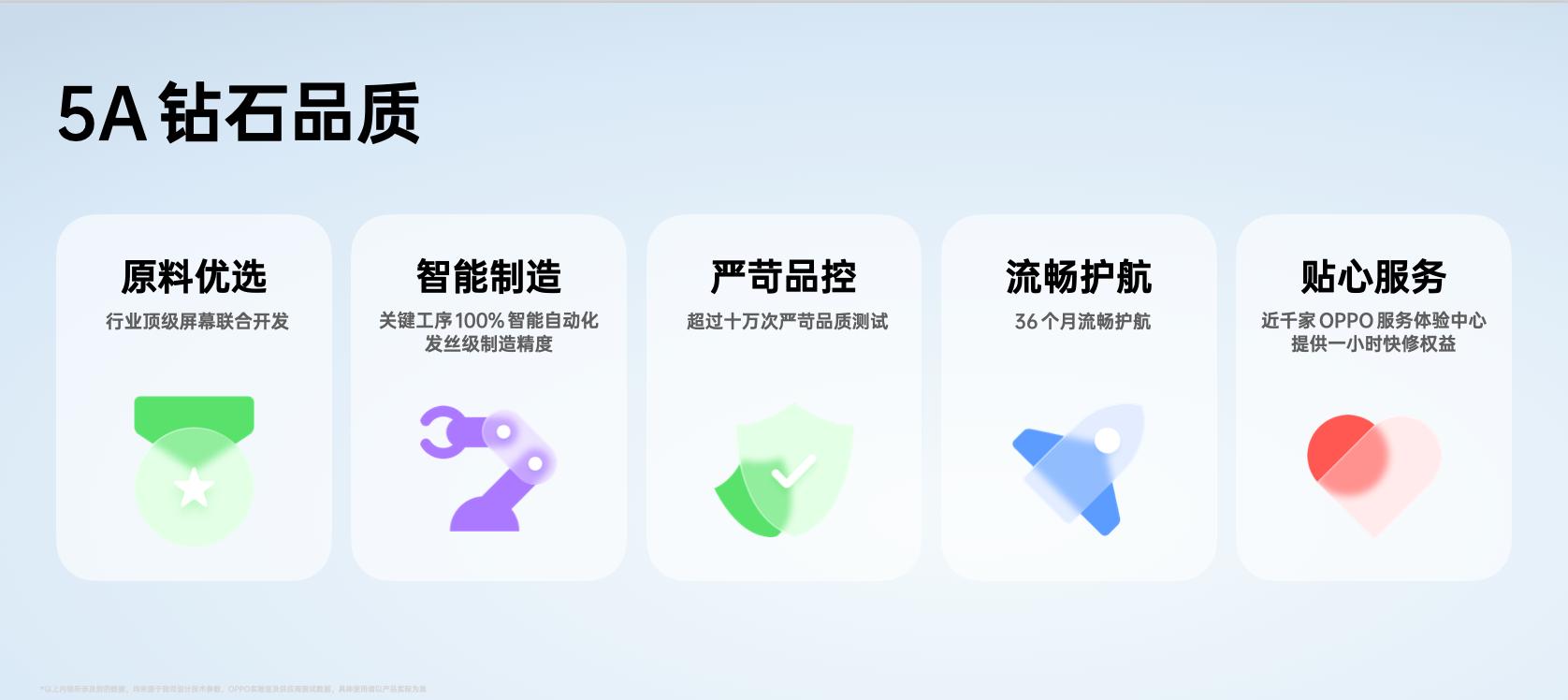OPPO A1 Pro拥有持久可信赖的5A钻石品质。OPPO以顶级标准进行原料优选,A1 Pro还参与到这块行业顶级屏幕的联合研发;在智能制造上,A1 Pro的关键工序实现100%智能自动化,带来发丝级制造精度。A1 Pro还有超过十万次测试的严苛品控、36个月流畅护航,并能享受近千家OPPO服务体验中心的快捷贴心服务。