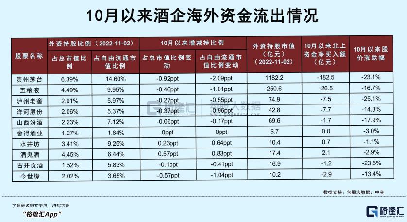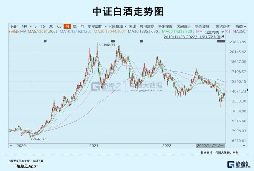 然而,北向资金在10月以来加大了白酒的抛售力度。据中金统计,在10月10日-11月2日,外资累计减持茅台182.5亿元,减持五粮液26.5亿元。外资集中抛售,加剧了内资跟风与恐慌,合力导致白酒板块在10月份整体大幅下跌23%,非常之迅猛与夸张。后来,在疫情优化以及大盘的回暖下,有所反弹,但似乎很快又陷入下跌之势中。
