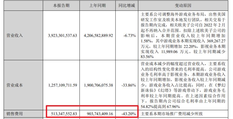 就拿今年上半年来说吧,三七的销售费用达到了四十亿,销售费用率达到了 53% 。但完美世界上半年的销售费用率才 13% 左右,总额只有五亿多。