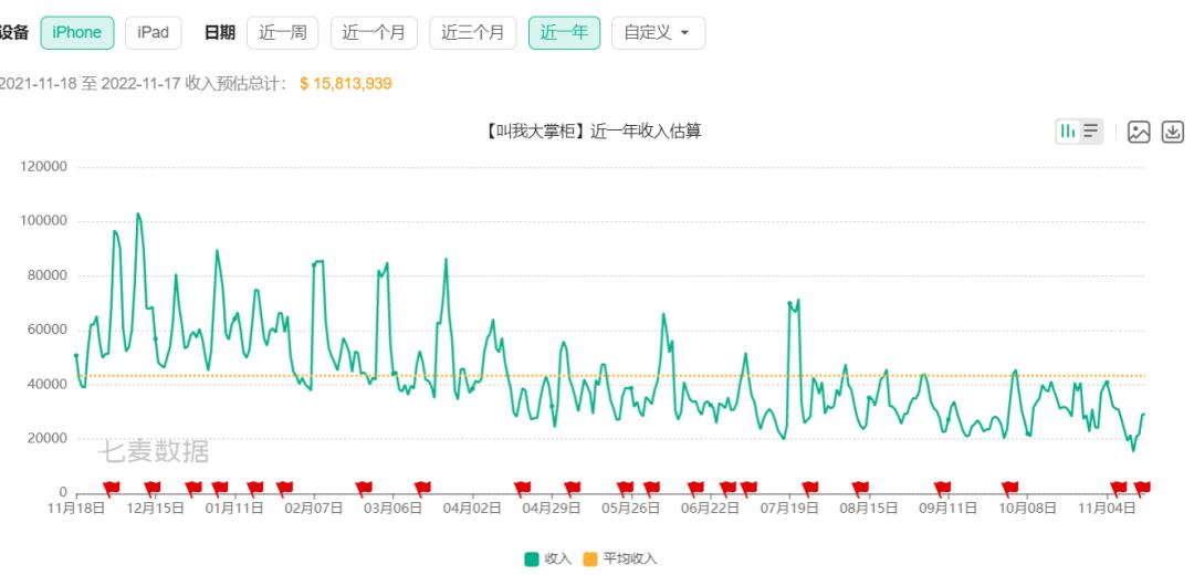 根据七麦数据的统计来看,《 叫我大掌柜 》近一年光是在 iOS App Store 上的收入,预估就能接近 1600 多万美元。