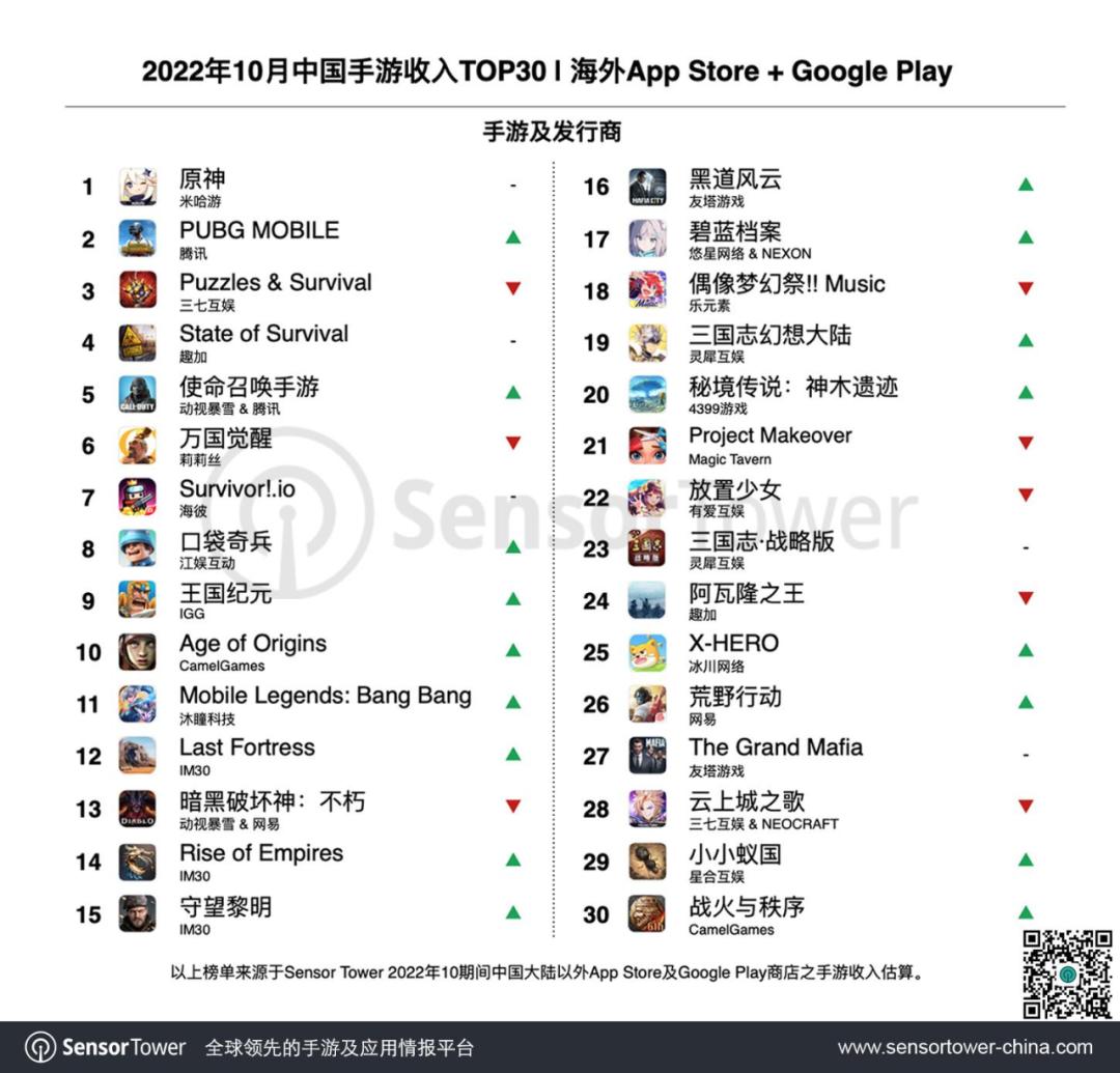 直到今年 10 月,游戏收入还能紧紧咬住《 PUBG MOILE 》和《原神》的后脚跟,挤到榜单前三。