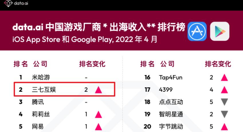 可能大家没注意到,三七互娱早就已经偷着摸发力了。今年四月份的时候,就已经把腾讯、莉莉丝和网易都挤了下去,爬到了出海收入榜单第二。