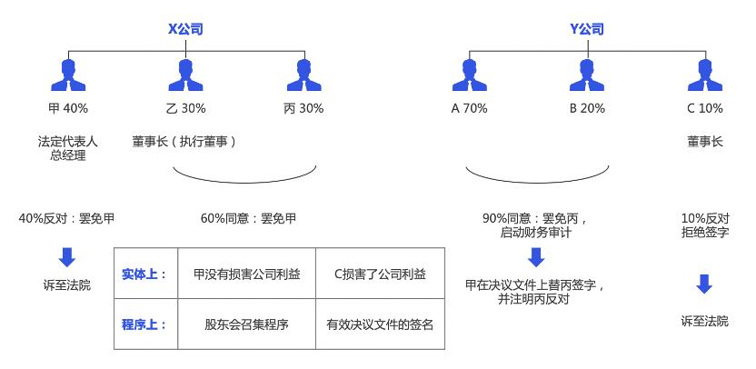 我们再来看另一种情形,Y公司有三位股东:甲70%、乙20%、丙10%,丙担任董事长。甲、乙发现了丙侵占公司财产的证据,于是甲召集股东会,提出了确实的证据,要求罢免丙,并且立即开始财务审计。当天形成了股东会决议,甲、乙签署了同意的意见,丙反对,并且拒绝签字。甲在决议文件上替丙签字,并注明丙反对。丙起诉到法院,要求撤销股东会决议。请问法院会如何处理?