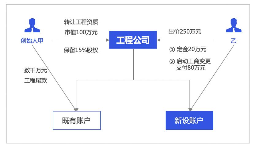 我们先来看一则案例:创始人甲因为业务下滑、市场不景气,考虑剥离一个工程公司。因为工程公司具有从业资质,所以市场上,此类公司的价值约为200万元。乙听说了这个消息,主动找到甲,表明自己正好要发展相关业务,需要买壳,愿意出价250万元。甲提出,他还有一些工程没有收尾,还有几千万的应收款,需要一年时间消化。乙提出,甲可以继续使用公司的账户直至业务全部做完,他收购公司后可以开设一个新账户,他的新业务就用新的银行账户,双方银行账户分开,互不干扰。