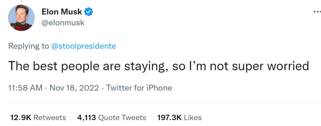 在周四晚上的一条推文中,马斯克说:“最优秀的人都留下来了,所以我不是特别担心。”