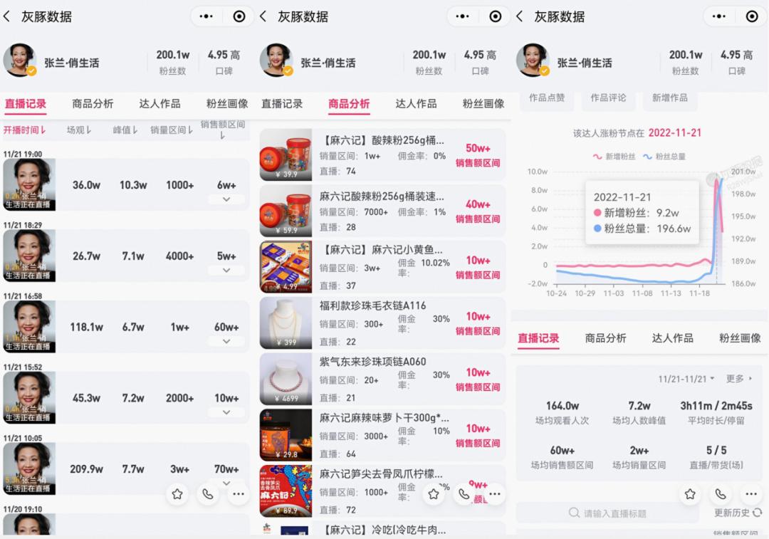 11月21日,张兰在抖音开启了五场直播,最早的一场在上午10:05开播,最晚的一场在晚上19:00开播,截至目前,张兰的抖音账号涨粉超过12万。灰豚数据显示,五场直播GMV超过150万元,39.9元的酸辣粉卖出了10000多份,贡献50多万元GMV;4.99元的小黄鱼卖出了30000多份,贡献10多万元GMV——对比前7天的数据,张兰此前的直播带货金额在10—20万元不等,11月20日的带货GMV约20万元,21日增长了近7倍。