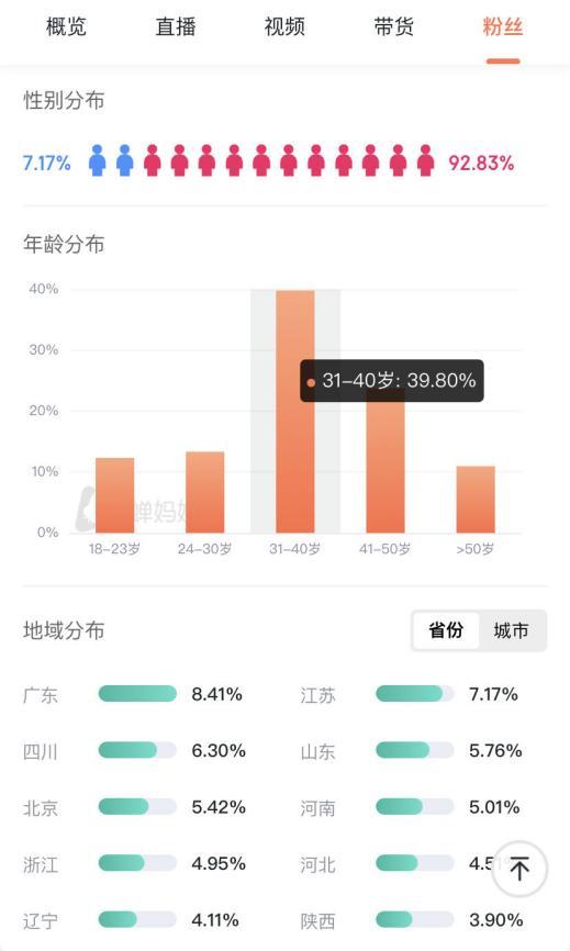 根据赵文铭提供的MCN后台数据,直播间的实际成交情况也符合这一认知——消费最多的用户画像为女性90%以上,沿海一线城市,31-40岁资深中产。