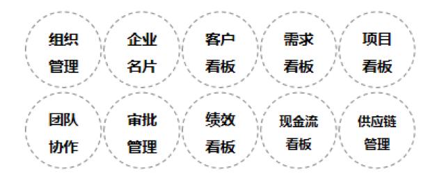 - 十大功能模块:组织管理、公司名片、客户看板、需求看板、项目看板、团队协作、审批管理、绩效看板、现金流看板、供应链管理。