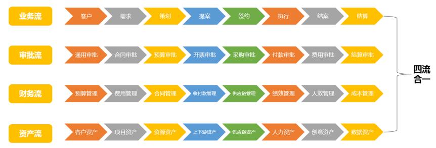 - 四流合一:业务流、审批流、财务流、资产流全面合体,数据归拢。