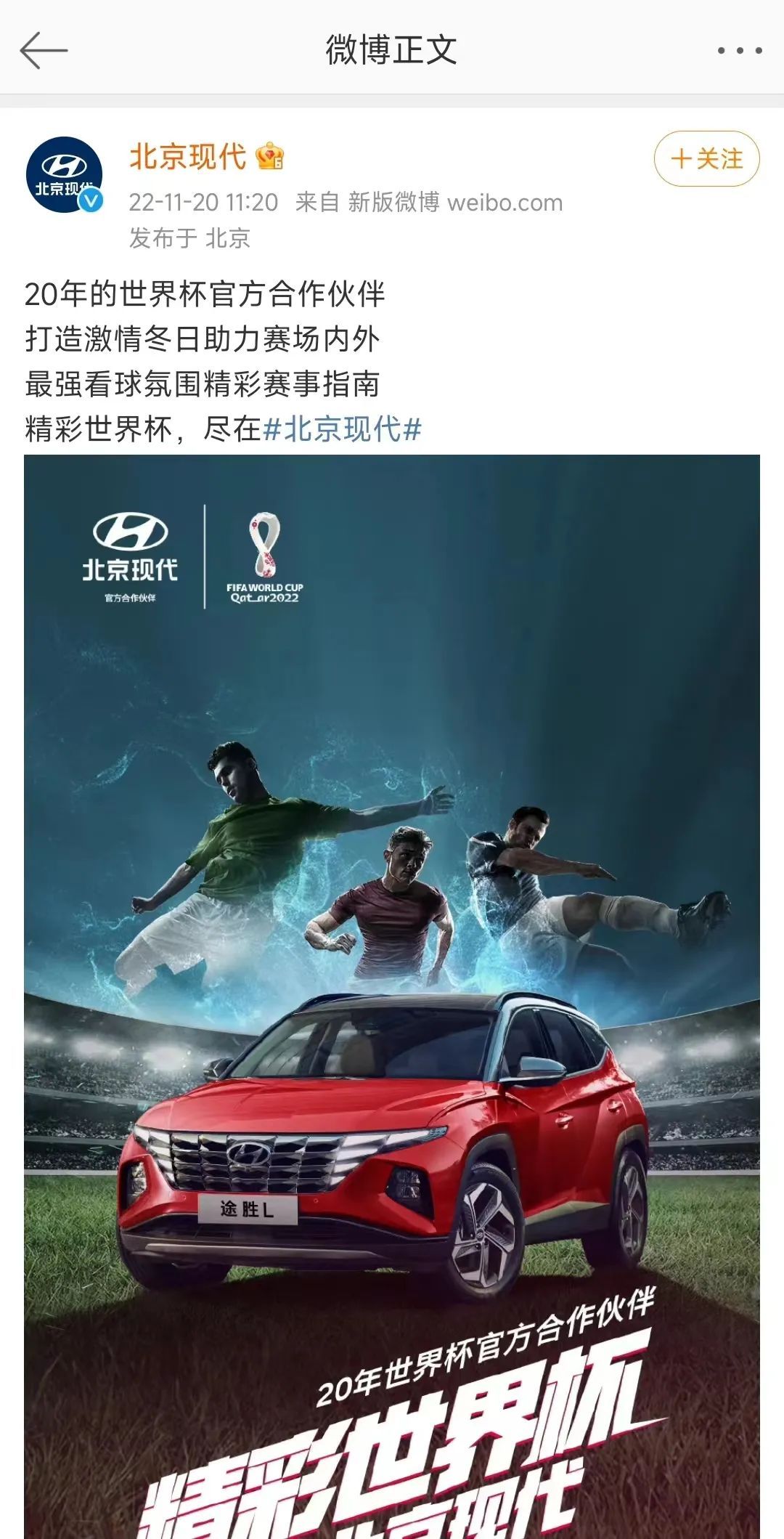 据连线出行观察,就本届世界杯自开赛以来,原本在往届举办这样线上线下活动的车企基本都没了声音,除了北京现代还在其官方微博发布了与世界杯相关的海报之外,上汽通用、比亚迪、长城汽车等车企均没有发布相关的活动或者话题。