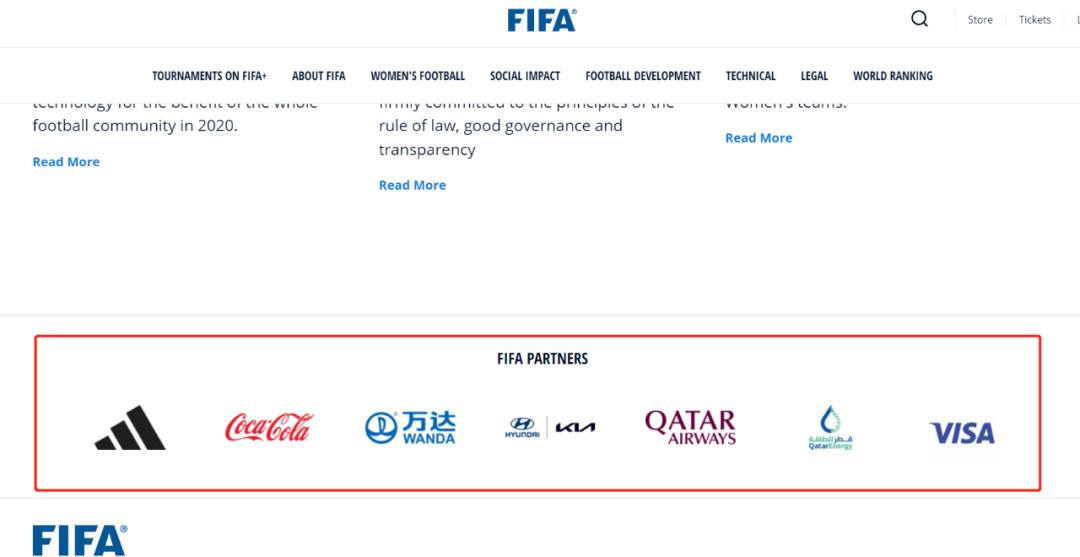 就拿本届卡塔尔世界杯为例,现代汽车、万达和VISA在内的七个国际足联合作伙伴的logo,已在FIFA官网明显位置中出现。这之外,每场比赛的场边四周电子屏幕上也会轮流露出这些官方赞助商的logo。