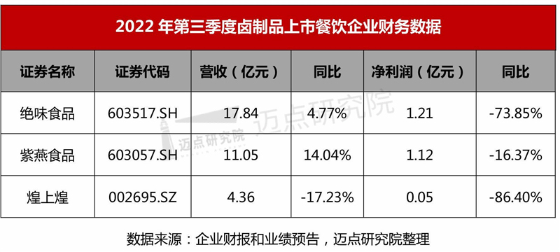 随着物流费用、人力成本以及原材料费成本的上升,卤味企业净利润连续下滑。从营收和净利润来看,绝味食品、紫燕食品第三季度营收同比增长,但三家卤味上市企业绝味食品、紫燕食品、煌上煌净利润均出现了下滑。